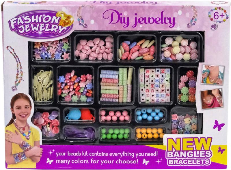Obsah balení: korálky, přívěsky (písmenka, kvítky, motýlci, mušle, hvězdice atd.), provázky