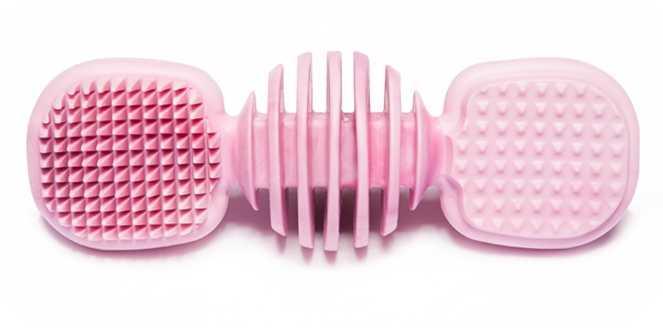 Dentální hračka pro psy - kartáček s různě tvarovanými vystupky díky svému tvaru stírá plak ze zubů během hry. Napomáhá tedy denální hygieně.