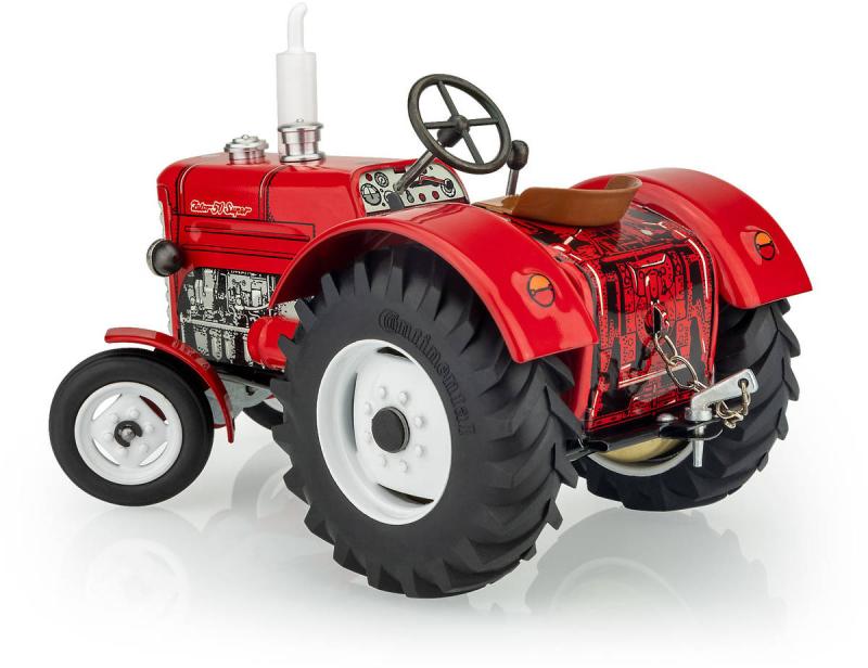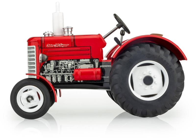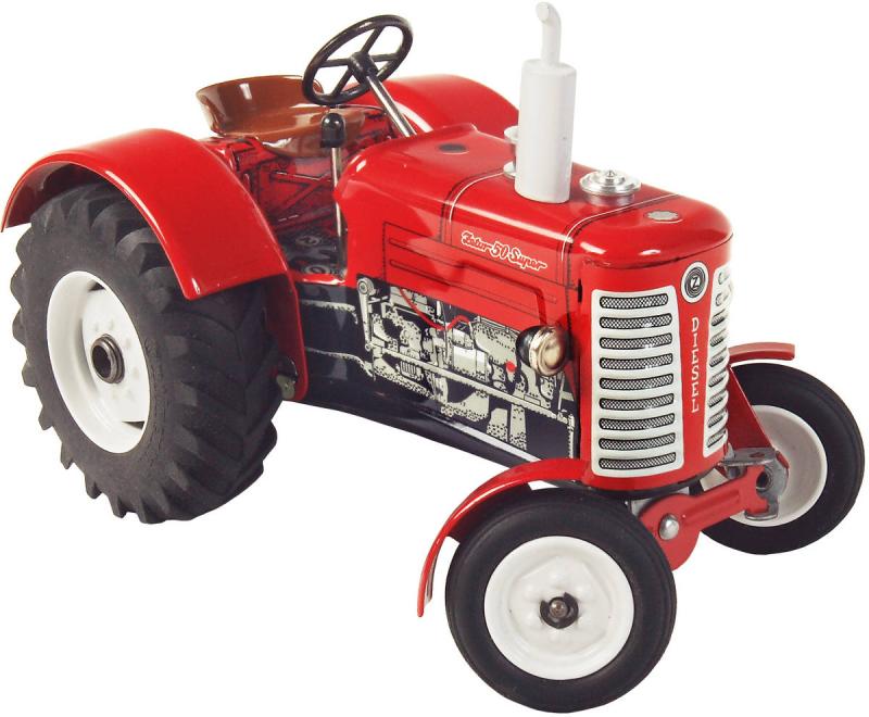 ***Traktor Zetor 50 Super. Pohon plechové hračky zajišťuje mechanický pérový strojek natahovaný klíčkem. Traktor má čtyřrychlostní převodovku. Disponuje třemi rozdílnými rychlostmi vpřed, zpátečkou a neutrálem. Je rovněž vybaven ruční brzdou. Přední náprava je řiditelná volantem. Měřítko 1:25.
