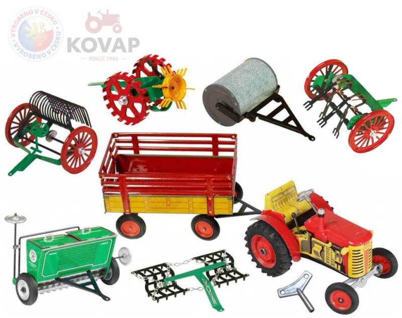 Hračky Kovap jsou vyrobeny z potištěného plechu. Pohyb všech traktorů zajišťuje unikátní pérový strojek natahovaný klíčkem. Funkční převodovka má 3 rychlosti dopředu a zpátečku. Traktor lze volantem