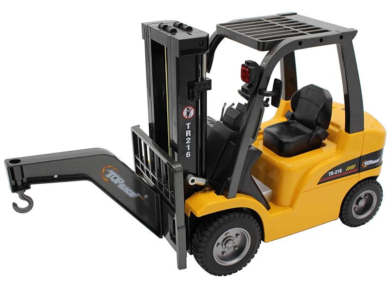 Vysoce kvalitní, stabilní a dobře vybavený vysokozdvižný vozík v měřítku 1:10. Rám kabiny, vidlice a případně použitelné rameno s nakládacím hákem jsou vyrobeny z pevného kovu.