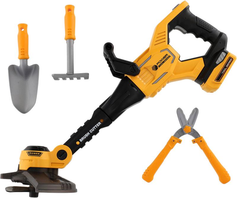 Plastový křovinořez. Dětské pracovní zahradnické nářadí. Realistické provedení. Součástí lopatka, hrábě a zahradnické nůžky. Hračka na baterie, se světlem a zvukem.Tento realistický křovinořez je perfektní hračkou pro malé zahradníky. Vyroben z kvalitního plastu, je lehký a snadno ovladatelný. Hračka je vybavena zvukovými efekty a napájena packem na baterie. Kompatibilní s dalšími nástroji stejné značky. Součástí balení jsou také praktické doplňky, jako je lopatka, hrábě a zahradní nůžky. Křovinořez má dvě polohy na délku, nastavit si můžete i sklon sekání. Ideální hračka pro malé kutily!