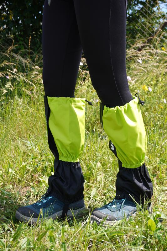 - Stahovací systém: Dvě našité stahovací gumy (na spodní straně u bot a nad kotníkem) a jedna stahovací šňůra pro upevnění na lýtko.