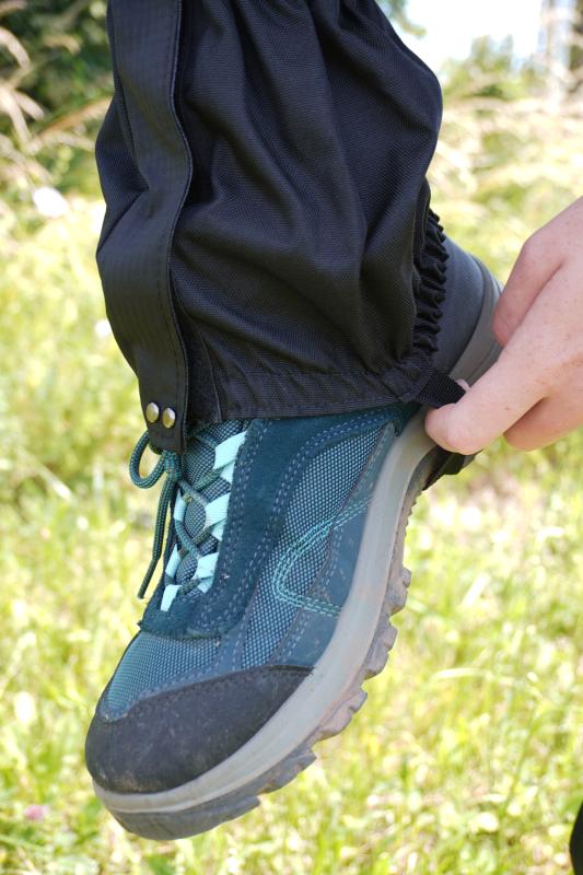 Na spodní straně je návlek vybaven stahovacím polyamidovým páskem s plastovou přezkou, která zajišťuje, že se návlek neposune či nevyhrne i při chůzi těžkým terénem. Pro chůzi v lehčím terénu pak slouží mosazný háček pro rychlé a jednoduché upevnění k šněrovadlům bot.