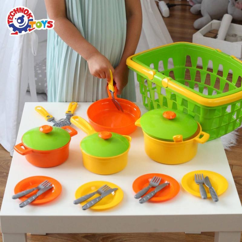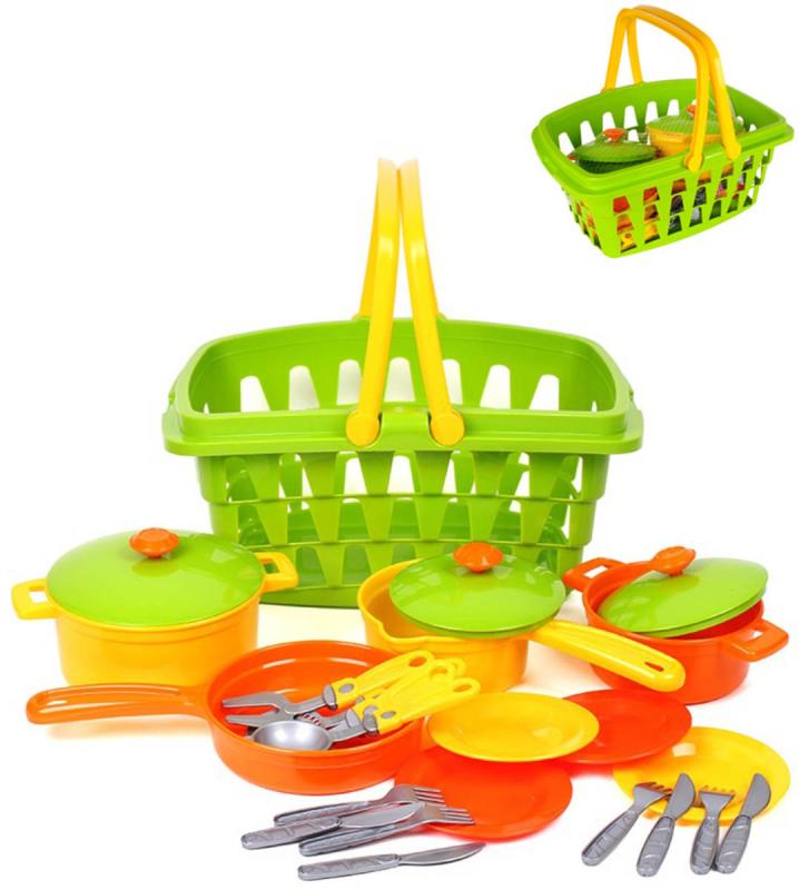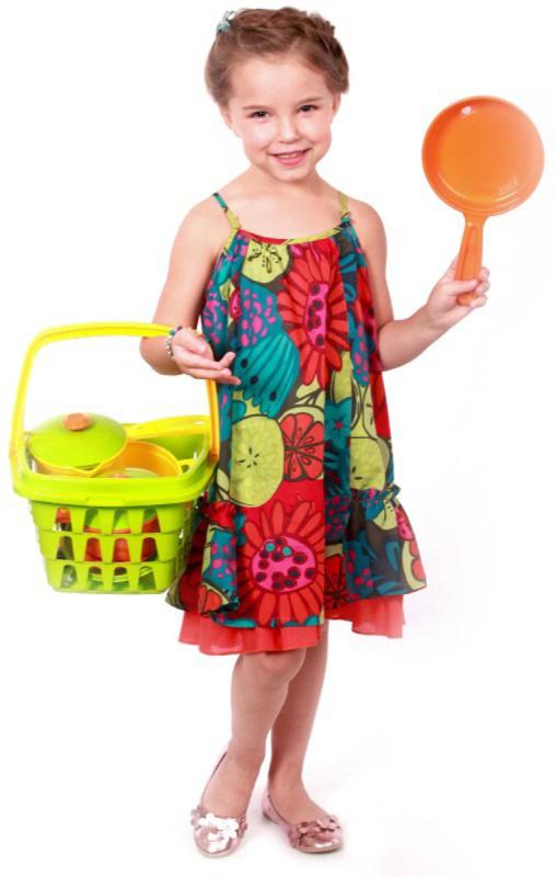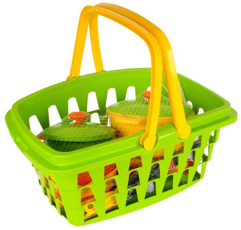 Se sadou hrnců, talířů a příborů si mohou malí kuchaři a kuchařky vařit co se jim zlíbí. Všechno mohou schovat do nákupního košíku. Kuchyňská sada v prostorném košíku je skutečným pokladem pro malou hospodyňku. Jasné barvy a rozmanitost nádobí jistě upoutají pozornost dětí i rodičů. Sada obsahuje vše, co potřebujete k přípravě lahodných pokrmů a pohoštění hostů. Velké hrnce s víčky, pánev s víkem a pánev na realizaci různých kulinářských nápadů. Škrabka, naběračka a stěrka učiní proces vaření co nejrealističtějším. Všechny hračky jsou uloženy ve velkém košíku se dvěma uchy. Můžete si tak vzít nádobí s sebou na procházku a uspořádat pro přátele opravdový piknik. Doma je pohodlné hračky sbírat do košíku a ukládat je do dětského pokoje.