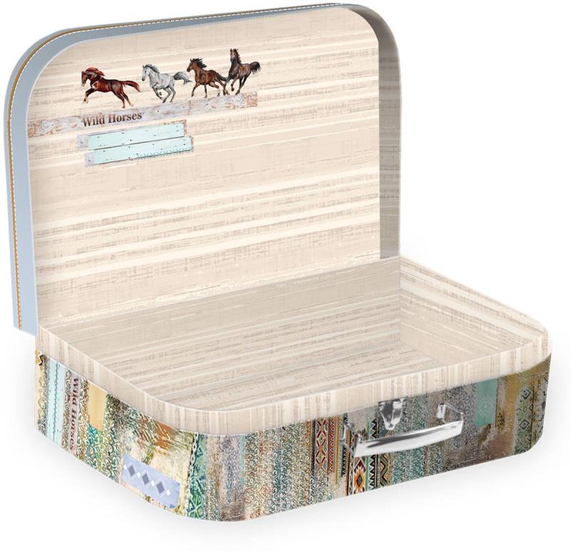 Dětský papírový kufřík s motivem Divocí koně o velikosti 35 x 25 x 10cm, kovové ouško a zapínání, pevný karton. Školní lepenkový kufr s vnitřním potiskem.Papírový dětský kufřík velikosti 35cm s motivem divokých koní. Kufřík je vyroben z kvalitního pevného kartonu s vnitřní potiskem a kovovým uzavíráním s rukojetí. Je vhodný na školní potřeby, výtvarné potřeby, vejde se do něj i blok barevných papírů A4. Jeho využití v dětském světě je velké ... možnost uložení hraček ale i jiných drobností na cestu k babičce.