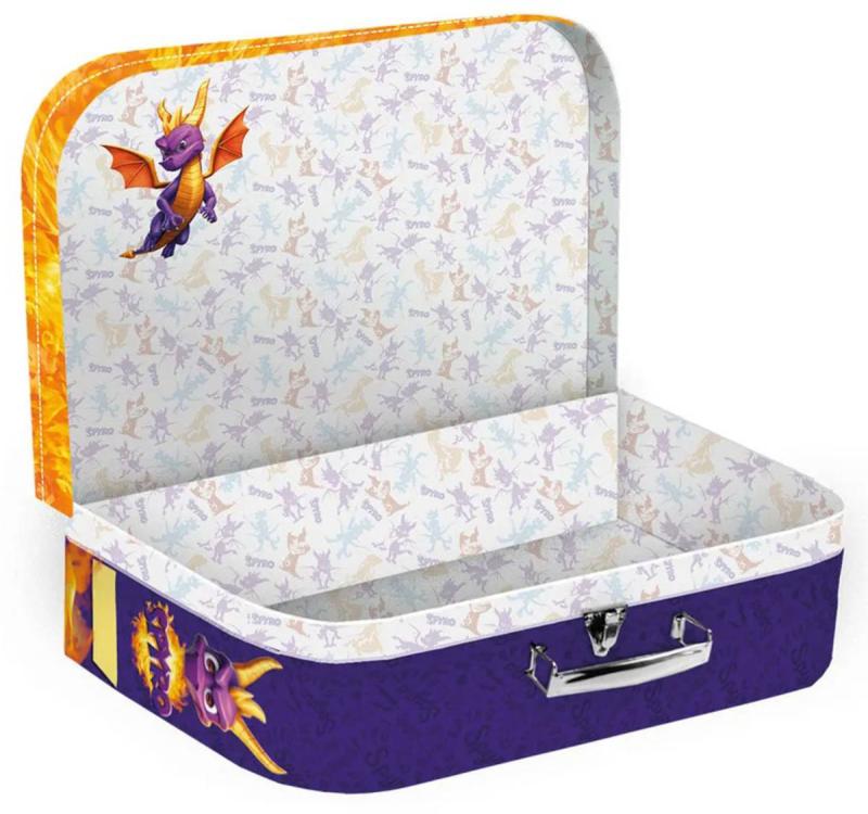 Krásný kufřík pro děti do školy, z tvrdé lepenky, s bytelným kovovým zapínáním a kovovým držadlem, s veselým potiskem s motivem dráčka Spyro.Tento lepený kufříček je vyroben z kvalitního pevného kartonu s vnitřní potiskem, s kovovým uzavíráním i rukojetí. Je vhodný zejména na školní a výtvarné potřeby, do zájmových kroužků, lze do něj ale uložit i hračky a jiné drobnosti a využít jej tak např. na cestování.