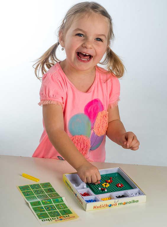 Za pomoci pinzety si děti skládají obrázky z barevných kuliček na podložku a tím si procvičují jemnou motoriku a šikovnost prstíků. Obrázky si mohou složit dle přiložených nákresů nebo dle své vlastní fantazie. Mozaika obsahuje 250 ks kuliček, pinzetu, oboustrannou destičku a papírové předlohy