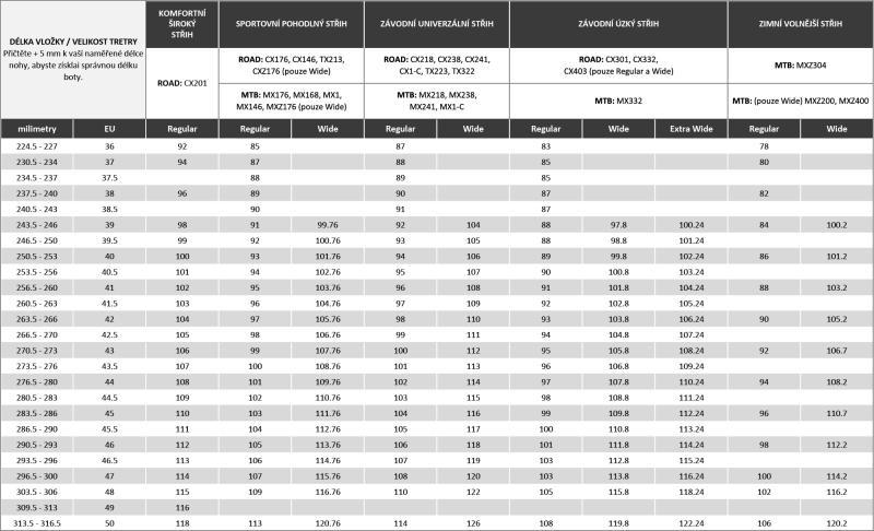 - WIDE: celá čísla - 37-48; 50, půl čísla - 39,5-46,5