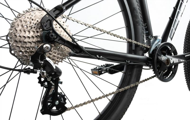 Pro spolehlivou kontrolu a bezpečné zastavení jsou vybaveny kotoučové brzdy TRP Slate T4 se čtyřpísty a 160mm rotory, které fungují dobře i za mokra nebo v náročných podmínkách. Přesné řazení zajišťují komponenty Shimano, konkrétně přehazovačka Altus RD-M310-L, přesmykač Altus FD-M2020, pravé řazení SL-M315-8R s 8 rychlostmi a levé řazení Alivio SL-M3100-2L se 2 rychlostmi. Kazeta nabízí rozsah 11-36T, což umožňuje snadné přizpůsobení rytmu jízdy terénu.