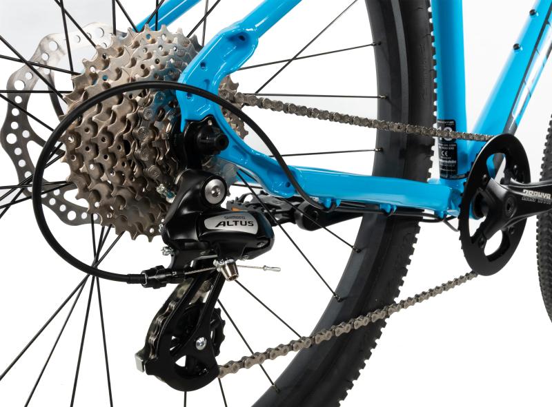 Středně široké pláště značky CST o rozměru 27,5×2,10 palce zajišťují stabilitu a jistotu v každém terénu, což umožňuje plynulou a kontrolovanou jízdu. Řazení Shimano Altus s osmi rychlostmi umožňuje hladkou a přesnou změnu převodů, ať už jedete do kopce nebo zrychlujete na rovině.