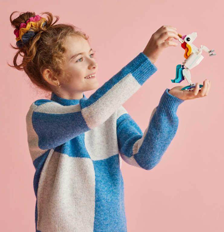 Nápadité děti od 7 let se přenesou do fantastického světa, kde si užijí vzrušující akci se stavebnicí Kouzelný jednorožec- Přináší model jednorožce se zlatým rohem, barevným ocasem a pohyblivýma nohama a kopyty. Na duhovém podstavci si ho můžete vystavit ve 2 polohách: stojícího na všech 4 nohách nebo na zadních. Se 3 různými okouzlujícími tvory, které si mladí stavitelé postaví se stavebnicí LEGO Creator 3 v 1, magická dobrodružství nikdy neskončí. Mohou si vybrat polohovatelného kouzelného jednorožce, přestavět ho na pohyblivého mořského koníka s podstavcem v podobě mořského dna nebo postavit nádherného páva s barevným ocasem. Nebo můžou zapojit svou fantazii a vytvořit si jedinečná zvířata podle sebe. Stáhněte si aplikaci s návody LEGO Builder, která dětem umožní vychutnat si zcela novou porci zábavy při stavění díky funkcím přibližování a otáčení modelů ve 3D, ukládání stavebnic a sledování postupu.