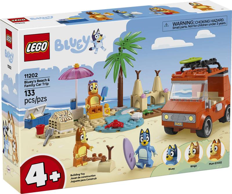 LEGO 11202 - Bluey a rodinný výlet autem na pláž z produktové řady LEGO DISNEY - Kvalitní dětská plastová stavebnice v krabici.Bluey a rodinný výlet autem na pláž je stavebnice s Bluey, Bingo a maminkou, které si do auta balí všechno potřebné na zábavný den na pláži. Tato interaktivní hračka pro fanoušky televizního seriálu Bluey je ideální pro děti od 4 let. Nabízí nekonečné možnosti nápaditého hraní a rozvíjí jejich představivost a schopnost řešit problémy. Tato stavebnice LEGO obsahuje milované vozidlo z televizního seriálu Bluey se 2 surfovacími prkny připevněnými na střeše a kufrem na uložení chladicího boxu. Vyklápěcí střecha auta umožňuje dětem snadný přístup do interiéru, kde jsou sedadla pro minifigurky Bluey, Bingo a Chilli (maminky Bluey). Mezi plážové prvky, které inspirují děti ke kreativnímu hraní, patří působivý hrad z písku, ocas mořské panny z písku, do kterého se vejde minifigurka, lehátko, slunečník a palma. Nechybí krab, zmrzlina, sluneční brýle a opalovací krém. Díky velké začátečnické kostce a barevné brožurce s návodem na stavění se děti od 4 let můžou hned pustit do hraní.