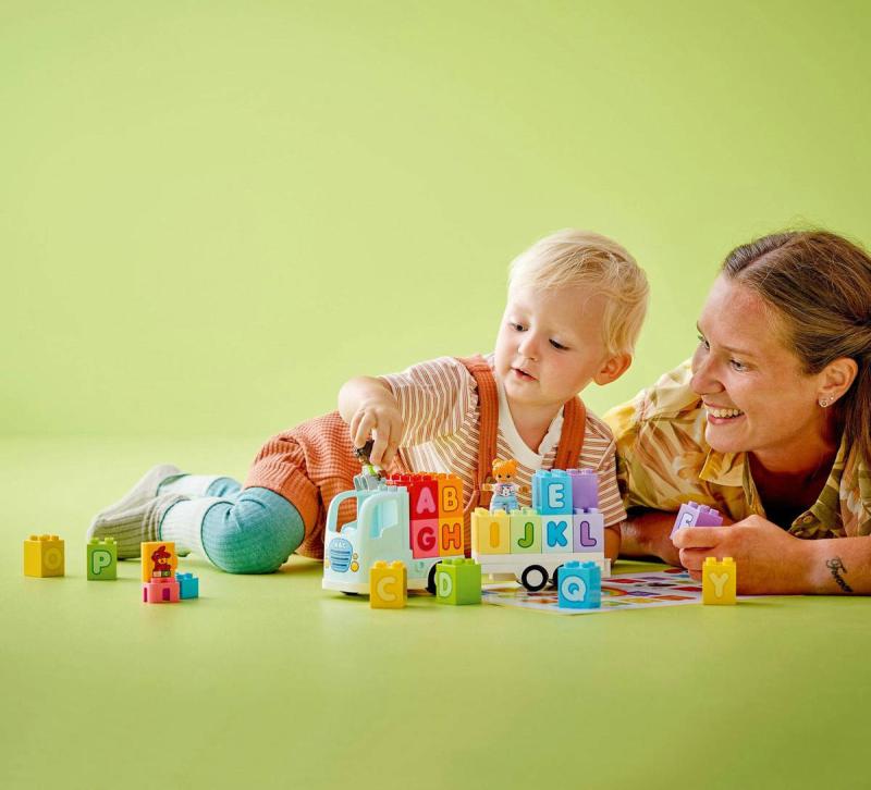 Stavebnice Náklaďák s abecedou malým dětem pomůže naučit se poznávat písmenka. Tato kreativní hračka s abecedou přináší spoustu možností učení hrou. Malé děti si vyzkouší připojení přívěsu k náklaďáku, pomohou 2 figurkám LEGO DUPLO naskládat a vyskládat kostky a naučí se rozpoznávat písmena, barvy, zdokonalí mluvení a procvičí si jemné motorické schopnosti. Ve stavebnici LEGO DUPLO s písmenky na děti čeká řada nápaditých doplňků, včetně knížky a sterea, které malé stavitele povzbuzují k recitování abecedy společně s rodiči. Tato vzdělávací hračka inspiruje batolata k vymýšlení kreativních příběhů. Za volantem modelu náklaďáku čekají nápaditá dobrodružství!