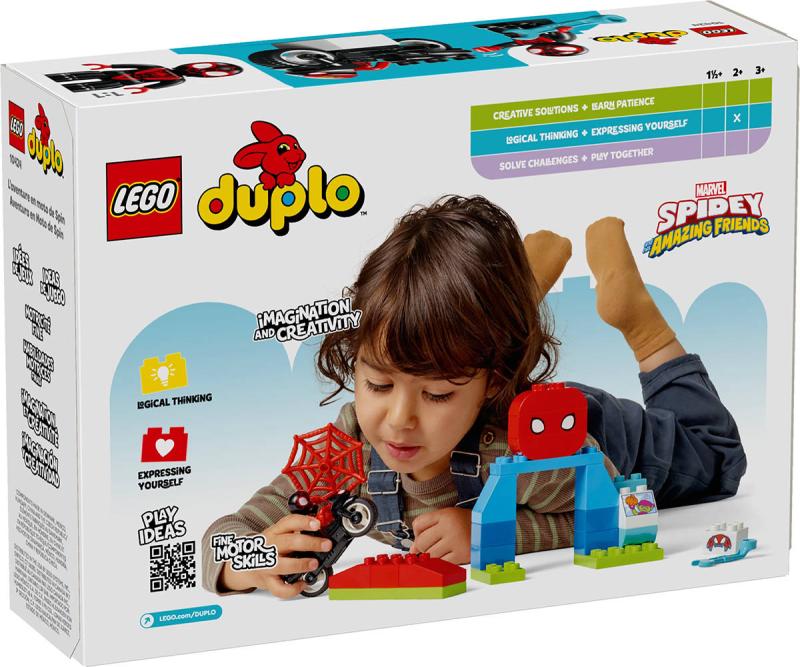 Se stavebnicí Spin a dobrodružství na motorce se malé děti vydají na superhrdinskou akci. Tato vzdělávací hračka umožní malým stavitelům od 2 let zachránit svět a postavit si scény inspirované seriálem Spidey a jeho úžasní přátelé z dílny studia Disney+. Tato fantasy stavebnice se Spideym je ideální na krátké zábavné hraní na každý den. Obsahuje figurku LEGO DUPLO Spina, hračku motorky a sestavitelnou základnu. Malé děti Spina usadí na motorku, přejedou po rampě a vrhnou se s ním do akce. Uprostřed boje pomohou figurce Spina vyhnout se letícím kostkám tím, že je chytí do pavučiny. Tato kreativní vzdělávací hračka pomáhá rozvíjet logické myšlení a jemné motorické schopnosti dětí, které si při stavění jednotlivých prvků vymyslí sled událostí. Malí stavitelé si procvičí sebevyjádření rozpoznáváním emocí, které Spin během děje může prožívat, což jim pomůže pochopit vlastní pocity.