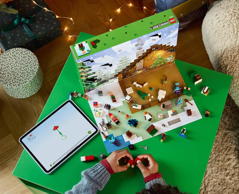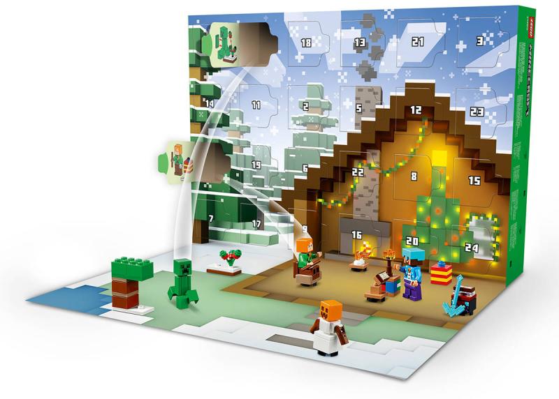 Za každým z 24 okének se skrývá jeden dáreček pro děti. Mezi minifigurkami najdete Alex ve svetru s motivem Creepera, Stevea ve svetru s motivem sněhuláka, diamantové helmě a s krumpáčem v ruce, Creepera u keře s bobulemi, utopence s trojzubcem, bludného kostlivce s diamantovou zbrojí, sněžného golema, zombie s očarovanou sekerou a vesničana Santu s pecí. Součástí je také spousta miniaturních modelů a parádních doplňků, které děti dobře znají ze své oblíbené hry. S blížícími se Vánocemi děti můžou jednotlivé dárečky kombinovat a vytvořit si mikro model zimní vesničky Minecraft plný nápaditých dobrodružství. Součástí stavebnice je navíc rozkládací hrací podložka, která poslouží jako dokonalé pozadí.