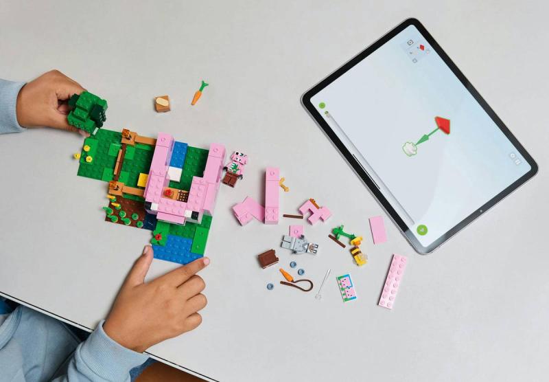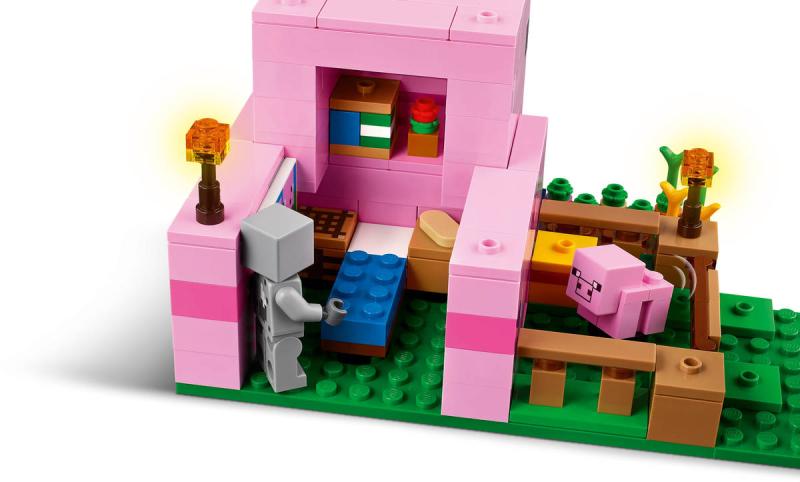 Domeček Prasátka je ideální hračka pro hráče Minecraftu, kteří milují stavění domů, zvířata a farmy. Tato tvořivá stavebnice Minecraft představuje skvělý dárek k narozeninám, Vánocům nebo jakékoli jiné příležitosti pro kluky i holky od 7 let. Tato kreativní stavebnice se odehrává v lesním biomu světa hry Minecraft. Součástí je řada figurek z této oblíbené videohry: Postava hrdiny ve vlčím skinu, prasátko, včelu, dospělé prase a zombifikovaného piglina. Děti si připomenou momenty ze hry – můžou například osedlat dospělé prase a pověsit nad něj mrkev, aby se projely kolem zahrady a domu v podobě prasete. Součástí je políčko, kde děti vypěstují brambory a řepu, a pole s bránou, skrz kterou provedete prasátko. Děti se vyhnou zombifikovanému piglinovi, který jim chce zkazit zábavu – stačí vstoupit do domu, kde najdou postel, knihovnu a pracovní stůl, které inspirují k nápaditému hraní. Aplikace LEGO® Builder dětem přináší další zábavu a pomocí svého zařízení v ní můžou přibližovat a otáčet modely ve 3D.