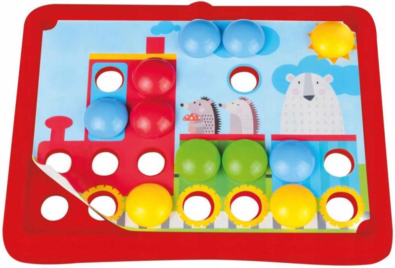 Mozaika s velkými kloboučky ve čtyřech základních barvách, se kterými mohou vytvářet obrázky nejmenší děti. K dispozici až 25 dírek na podložce. Námětem jsou dopravní prostředky. Baleno v krabici.