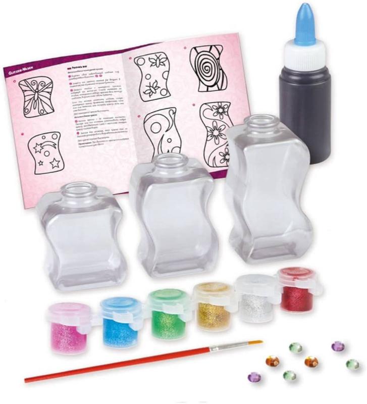 Obsah balení: 3x vázička, třpytivé barvy 6x, štětec, ozdobné kamínky, modelovací hmota na obkreslování tvarů
