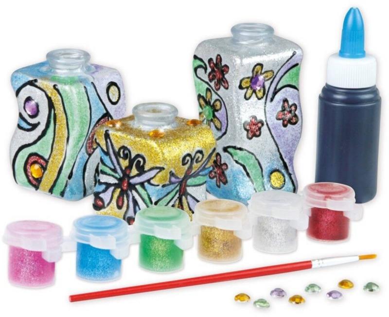 Třpytivé vázy - kreativní set s barvami. Malování na sklo. Součástí 3 vazíčky, 6 barviček, kamínky k dozdobení a další.Chcete kreativně zabavit děti a zároveň jim dát prostor pro vytvoření dekorace do pokojíčku nebo dárečku pro někoho blízkého? Tato sada je přesně to, co hledáte. Fantazii se meze nekladou, vyzdob si vázičky podle svého gusta!