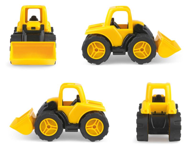 Žlutočerný čelní nakladač vyrobený z odolného ABS plastu s vysoce kvalitními pogumovanými koly, stavební stroj pro ty nejmenší stavitele na písek. 4mm pozinkované ocelové osy. Baleno v okrasném kartonu.