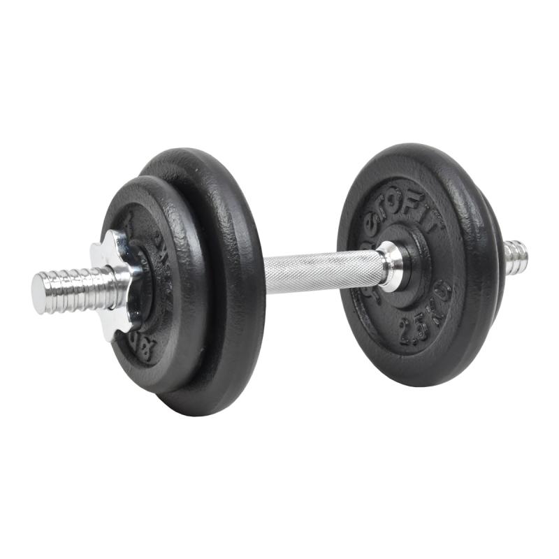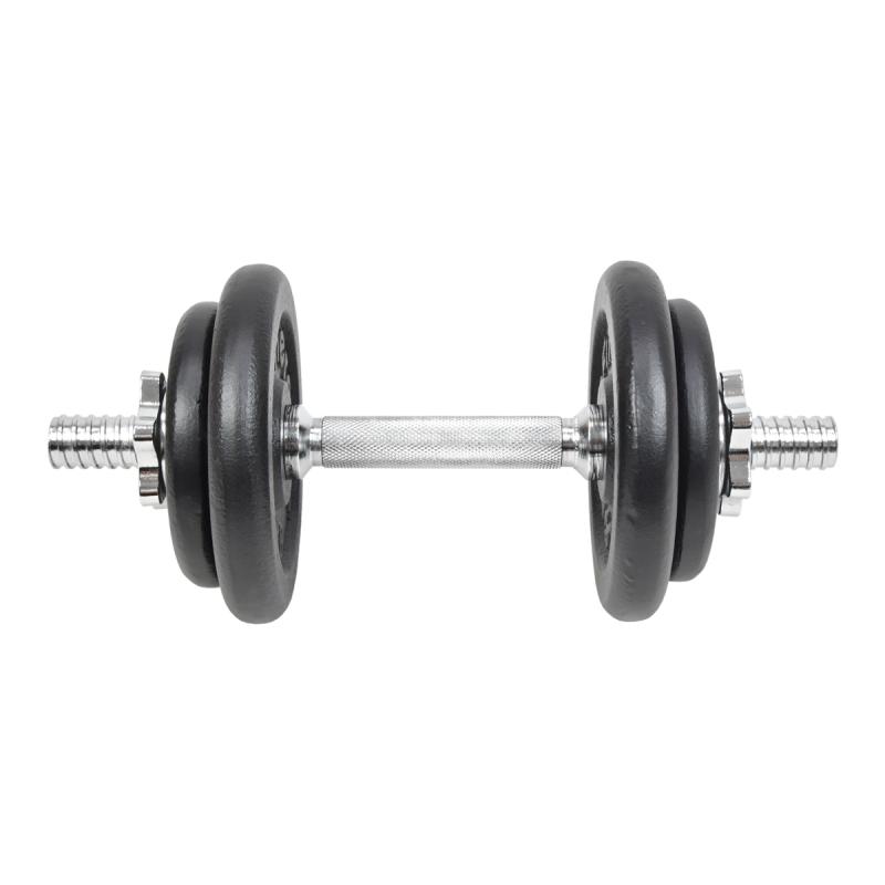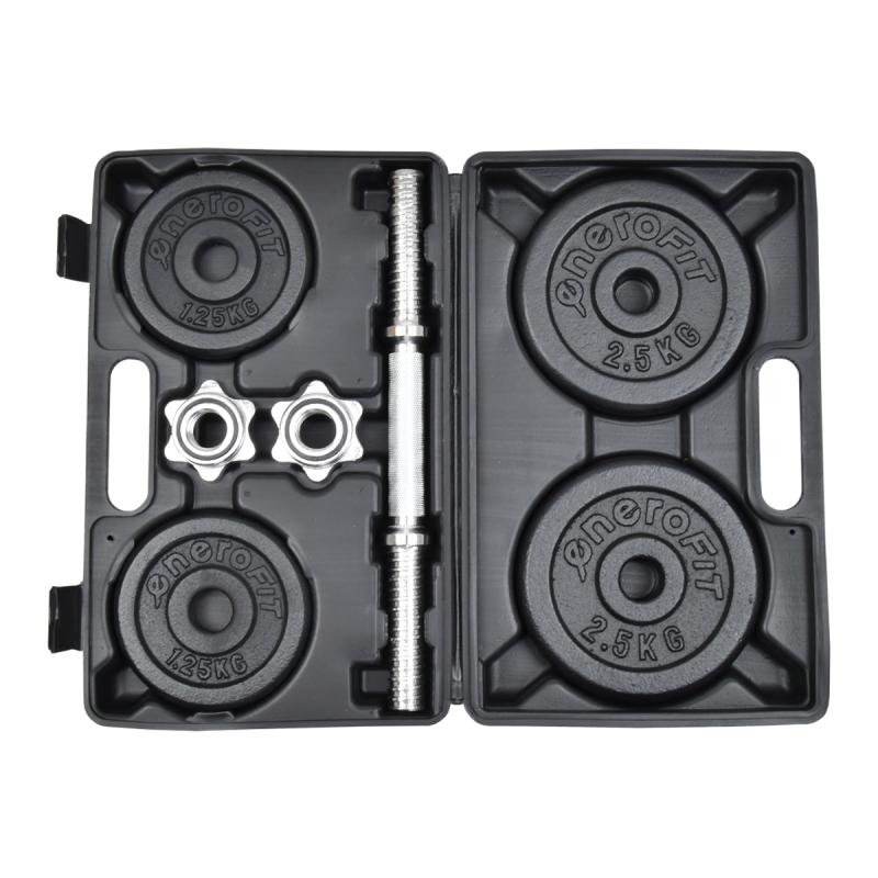 Činkový set s nastaviteľnou hmotnosťou až 10 kg, kovové kotúče s odolnou povrchovou úpravou a praktický plastový kufrík pre jednoduché prenášanie.Činkový set je vyrobený z kvalitných kovových materiálov, ktoré zabezpečujú dlhú životnosť a spoľahlivosť pri cvičení. Hriadele majú dĺžku 35 cm a sú opatrené závitmi na oboch koncoch, čo umožňuje jednoduché a bezpečné upevnenie závaží pomocou dodávaných bezpečnostných matíc.