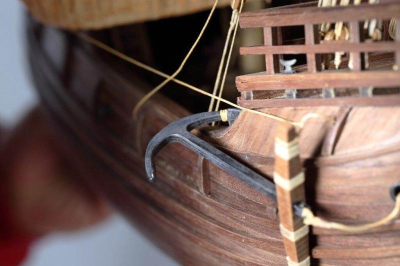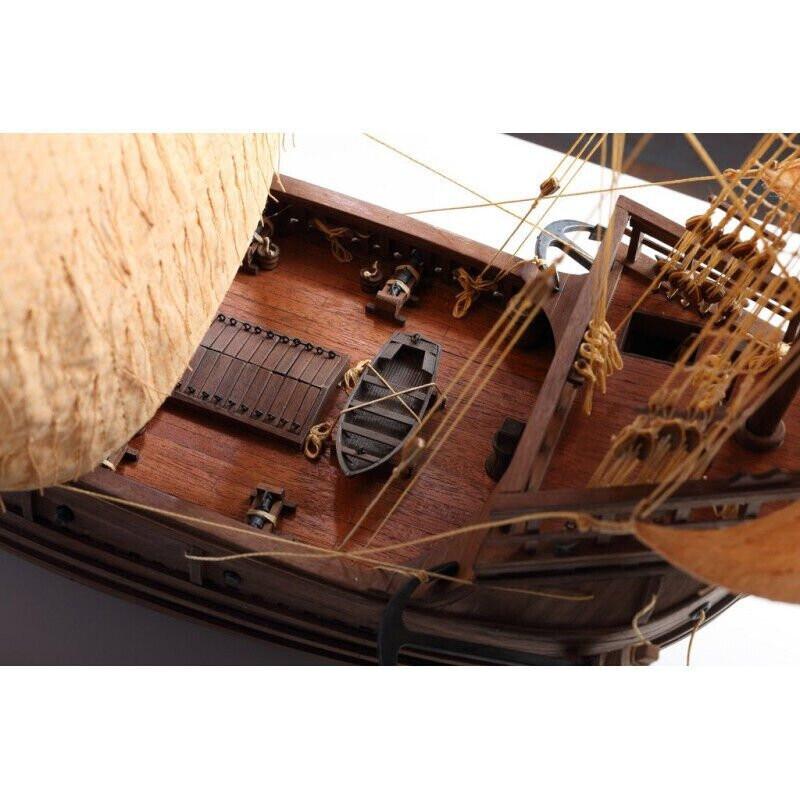 Model je vyrobený z kvalitného dreva Iroko, pričom kýl a rámy vznikli pomocou modernej laserovej technológie, čo zaručuje vysokú presnosť a pevnosť konštrukcie. Kovové detaily sú odlievané a dodávajú modelu autentický vzhľad, zatiaľ čo hotové plachty a sada vlajok umožňujú jednoduchú finálnu úpravu.