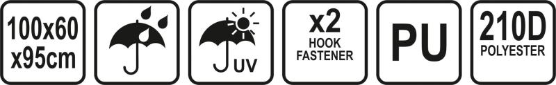 Rozměry krytu 100 x 95 x 60 cm, lichoběžníkového tvaru, vhodné pro grily LUND TO-99512, TO-99586, TO-99588, TO-99519, TO-99514, ale i jiné grily s obdobnými rozměry.
