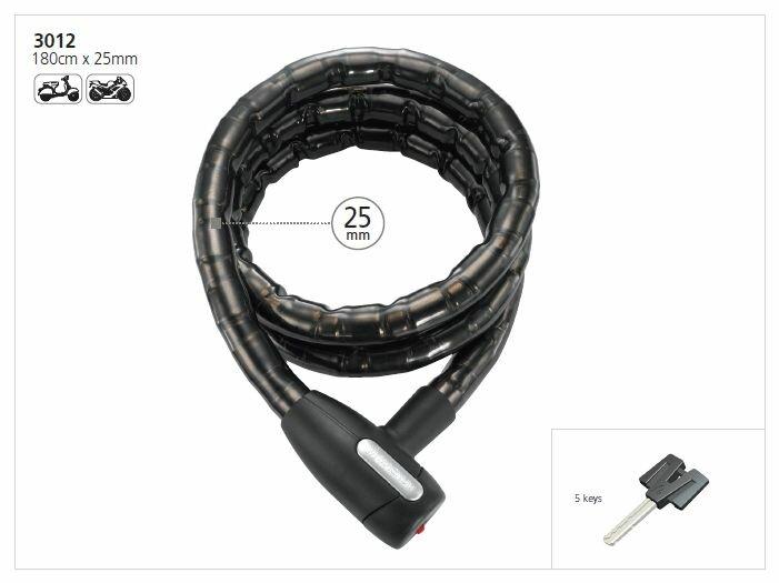 Pevné oceľové lano je kryté hliníkovými článkami a tvrdým ochranným plastom a bezpečnostnou hlavou, dĺžka 1800mm a priemer 25mm, 5 kľúčov. Hmotnosť 1350 g.Zámky MAGNUM majú tradíciu už od roku 1964 a využívajú celú radu vlastných patentov.