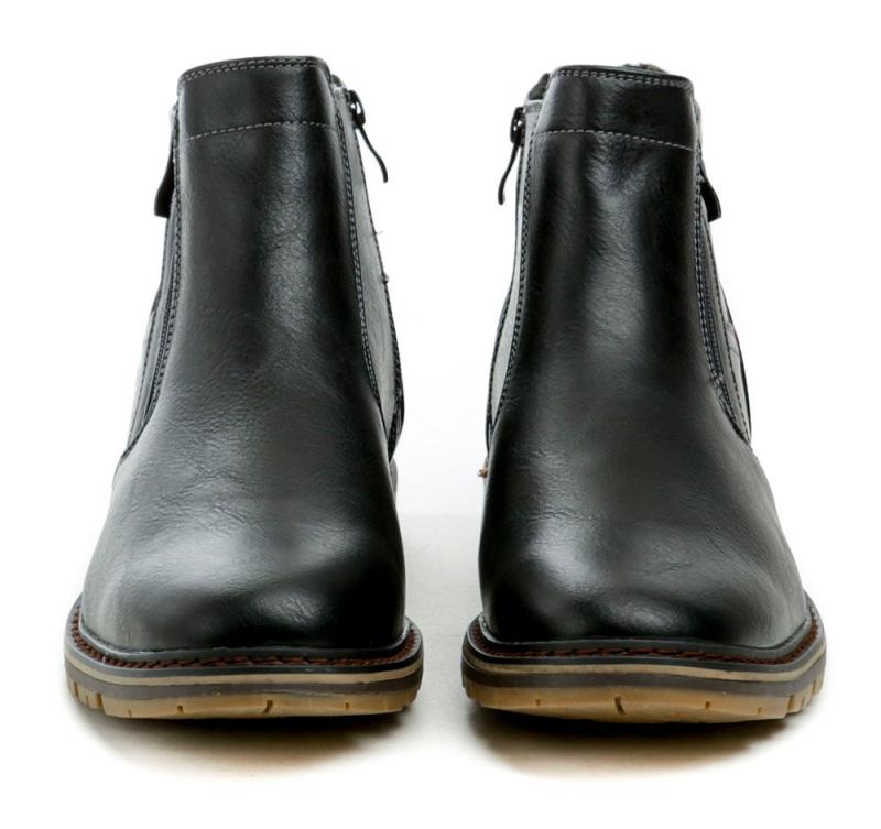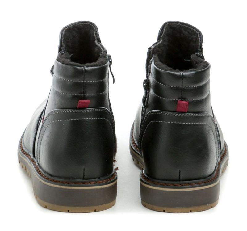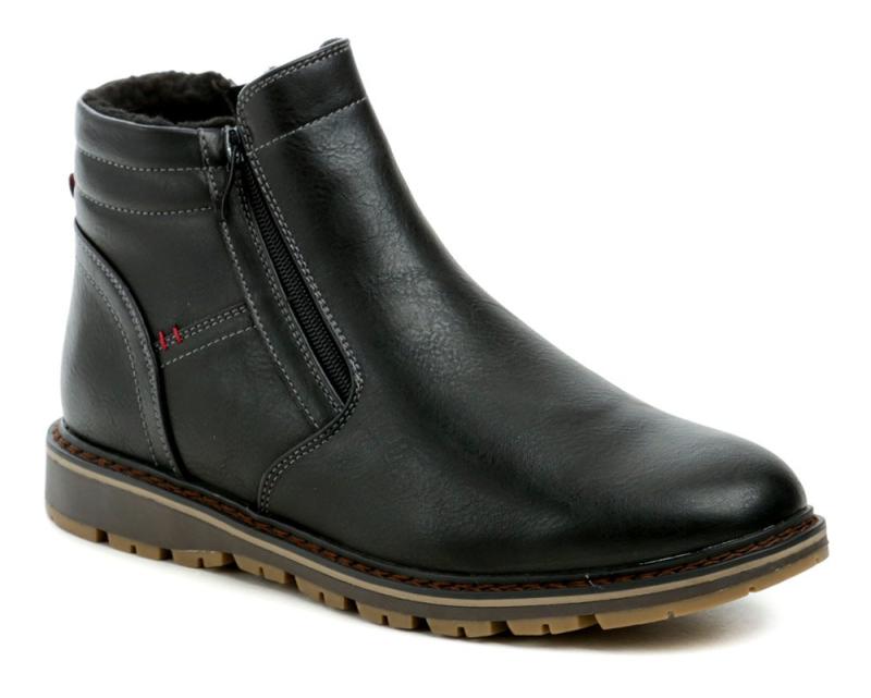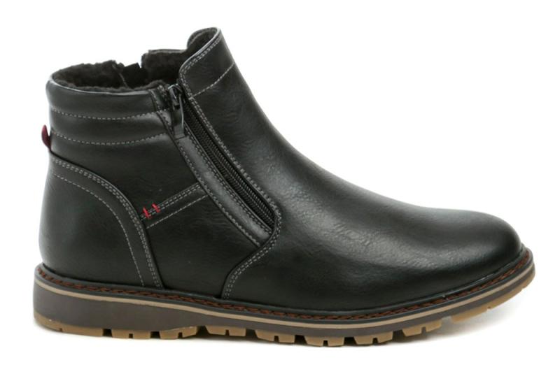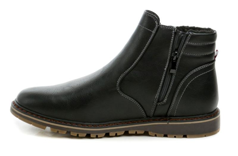 Pánska zimná členková vychádzková obuv so zapínaním na 2 zipsy.Obuv je vyrobená zo syntetického materiálu, ktorý nahrádza kožu. Vnútorná časť obuvi je chlpatým textilným kožušíkom, ktorý tvorí zateplenie.