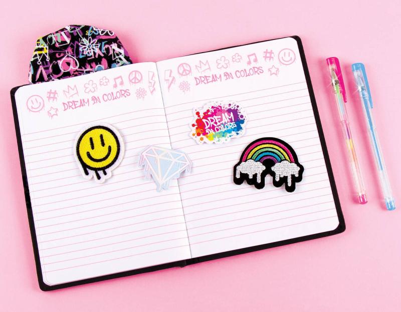 A pokud samotný deník a pera nestačí, aby tě "vtáhly", pak samolepky z vinylu a vyšívané nášivky ti určitě zpříjemní den! Sada obsahuje smiley face a duhové vyšívané nášivky, dále vinylové samolepky s kapičkou diamantů a grafiku "dream in color", což dohromady tvoří skvělou kreativní sadu.