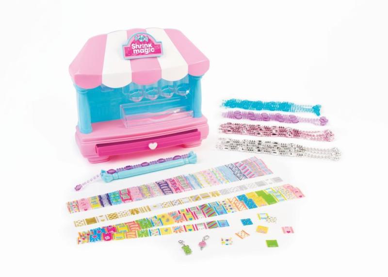 Cukrárna Shrink Magic Candy Shop je místo, kde se vyrábějí pamlsky na nošení, a kouzlo je ve smršťovači! Vybírejte, posouvejte a zmenšujte obaly a vytvořte tyto sladké a barevné doplňky! Vyberte pramen korálků, poté vyberte obaly s designem cukroví a zarovnejte je na korálky.