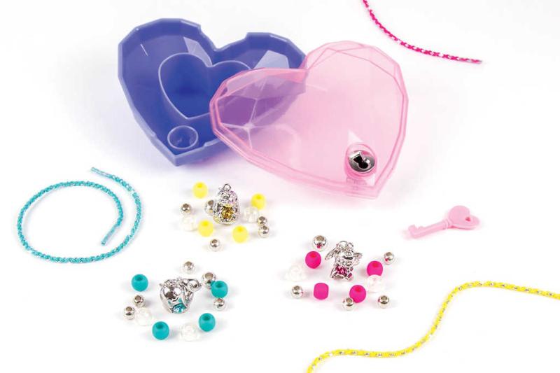Balení obsahuje: 3 náramky s přívěsky a krystalem SWAROVSKI, krabičku ve tvaru srdce, klíček, korálky, barevné šňůry, instrukce