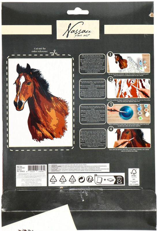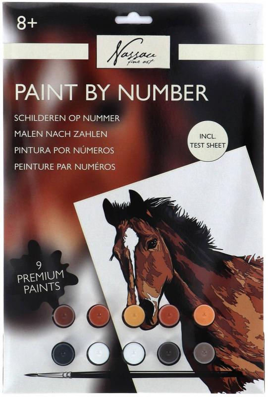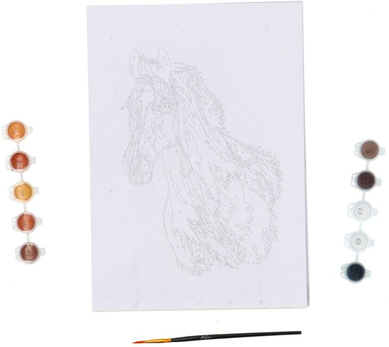 Malování podle čísel s motivem koně. Kreativní set s barvami a štětcem.Každý může být umělcem! S malováním podle čísel můžete vytvořit krásné obrazy, i když jste nikdy předtím nemalovali. V setu najdete vše, co k tvorbě potřebujete: 9 kelímků jemných barev s čísly barev, štětec, předtištěné kartonové pozadí a obrázek na krabici jako předlohu.