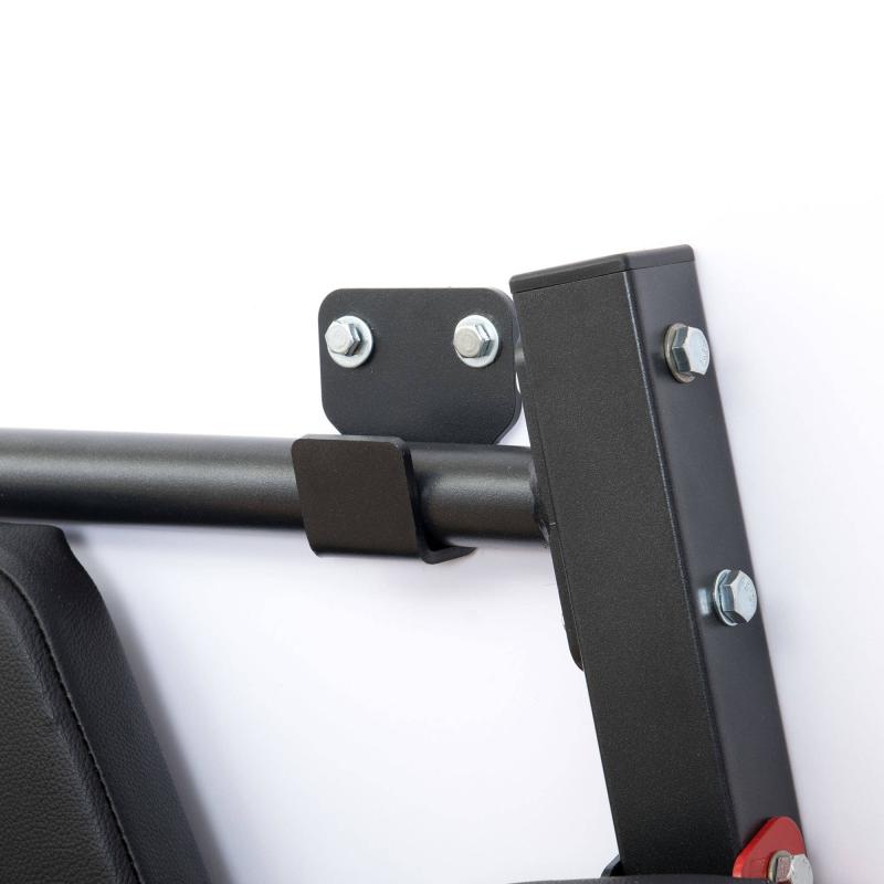 Vzdálenost úchytů bradel je 43, nebo 47 cm a můžete si je tak nastavit do ideální pozice. Jejich upevnění je zajištěno jedním šroubem, takže přenastavení Vám zabere jen pár vteřin. Polstrování je vyrobeno z hrubšího materiálu a je tak maximálné odolné vůči poškození, jako výplň je použita pěna o hustotě R90, tato vyší hustota zaručuje pohodlí pro lokty během přítahů kolen.