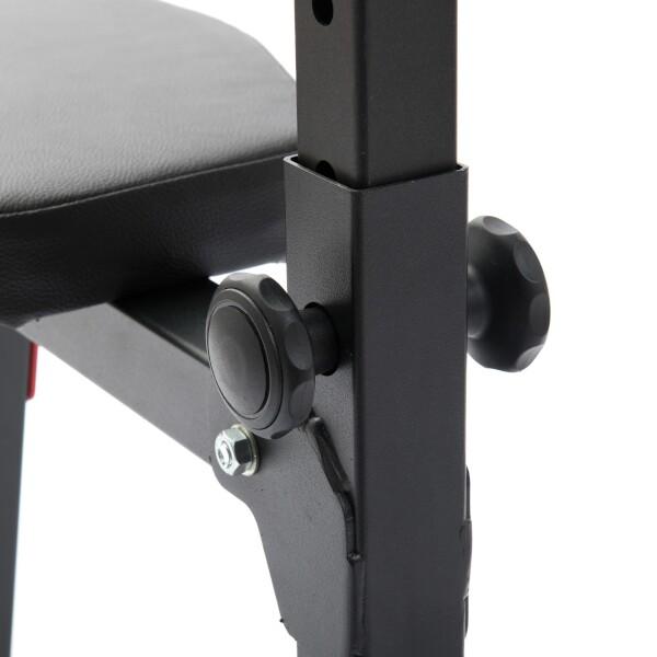 Konštrukcia lavičky MARBO MH-L105 2.0 je vyrobená z oceľového profilu 40 x 40 mm, vďaka ktorému má nosnosť až 250 kilogramov. Jednotlivé diely sú vyrobené na precíznych, programovateľných CNC strojoch, tento výrobný proces je zárukou bezproblémovej montáže a zároveň garantuje plnú stabilitu kompletnej lavičky. Operadlo je nastaviteľné do 5 úrovní a dokážete si ho tak perfektne prispôsobiť svojej výške. Regulácia sa vykonáva pomocou skrutiek s plastovým, ergonomickým úchytom. Háky pre odloženie činiek sú opatrené hrubou gumou, ktorá chráni ako činku, tak konštrukciu pred poškriabaním. Čalúnenie je vyrobené z hrubej, syntetickej kože a je ergonomicky tvarované. Jednotlivé diely sú k sebe spojené dvojitými švami pre maximálnu pevnosť.