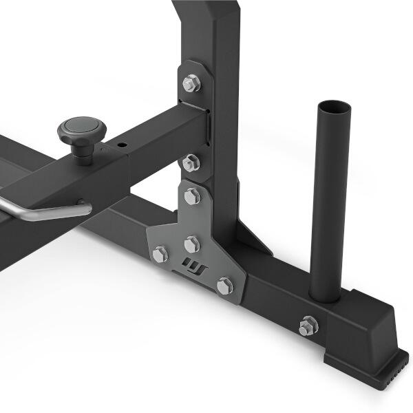 Stojany jsou propojeny příčkou. Rozteč mezi nimi lze snadno a rychle nastavit. K dispozici jsou 3 polohy: 100, 110 a 120 cm. Díky tomu můžete během tréninku používat osy různých délek bez obav o stabilitu jištění. Stojany zůstanou na svém místě a nerozjedou se ani při prudkém odložení závaží.
