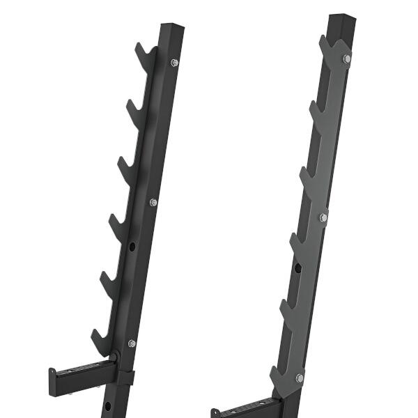 - 6 párů háků pro odložení činky – umožňuje variabilitu cviků a bezpečné odložení činky, pokud nemůžete dokončit celý pohyb.