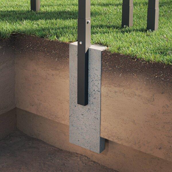 Pre dosiahnutie najlepších výsledkov odporúčame stĺpiky konštrukcie zapustiť do zeme v hĺbke aspoň 37 cm a následne ich zabetónovať - minimálne rozmery základu sú 25x25x60 cm.