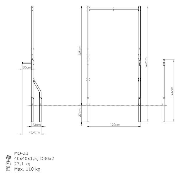 Hrazda je umístěna ve výšce 225 cm a poskytuje pohodlný úchop. Díky tomu můžete provádět širokou škálu silových a posilovacích cviků pro svaly horní poloviny těla. Jedná se o řešení pro začátečníky i pokročilé uživatele!