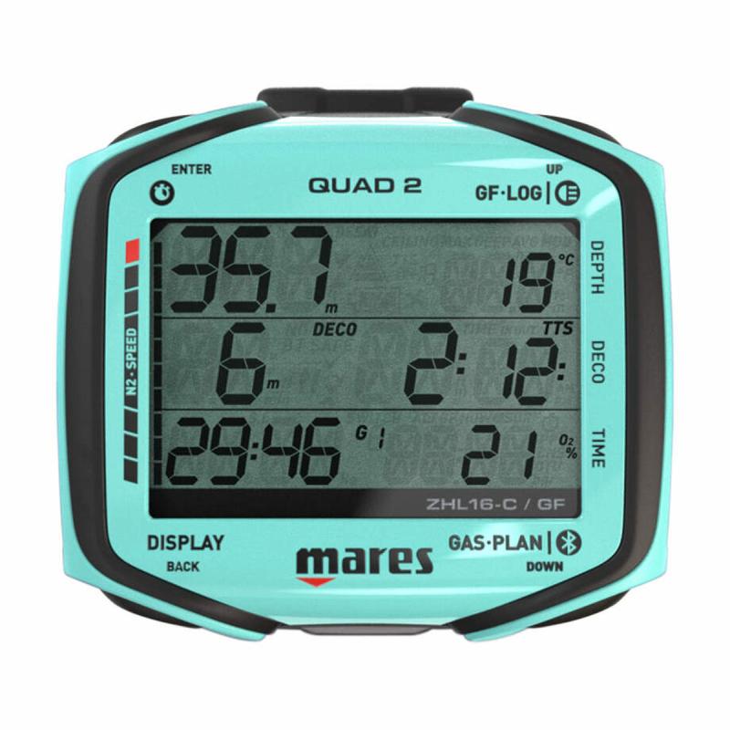 Mares QUAD 2 je potápěčský počítač s možností využívat více plynů. Samozřejmostí je také plánovač ponorů s doplňkovou funkcí povrchových intervalů a dlouhá životnost baterie, která je uživatelsky vyměnitelná.