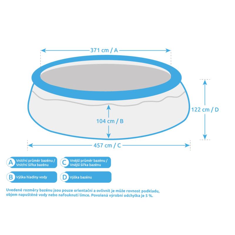 Bazén Tampa patrí medzi najpredávanejšie a najobľúbenejšie modely v Českej republike, ktorý umožňuje dopriať si kúpanie vo vlastnom bazéne naozaj každému. Tento model ponúka veľký kúpacej priestor s rozmermi 4,57 x 1,22 metra a vďaka svojmu konštrukčnému riešeniu je vhodný pre rýchle sprevádzkovanie i jednoduchú údržbu počas celej sezóny. Stačí pripraviť rovný podklad, rozvinúť bazénovú podložku, rozbaliť bazén, nafúknuť horný golier a začať napúšťať vodu. Stúpajúca hladina vody sama postaví steny bazéna. Od vybalenia je možné do 30 minút začať s napúšťaním vody, čo výrazne skracuje dobu prípravy na kúpanie.\n\nKvalitná bazénová fólia je tvorená trojvrstvovou laminovanou vrstvou s vystužením polyesterovou tkaninou. Hrúbka materiálu je 0,36 mm pri nafukovacom prstenci, 0,5 mm pri podlahe a 0,58 mm pri stenách. Toto spracovanie zaručuje dlhodobé a bezproblémové užívanie bazéna, ak je správne udržiavaný.\n\nJednoduchá montáž umožňuje postaviť bazén bez nutnosti stavebných úprav pozemku. Nafúknutie horného prstenca a postupné napúšťanie vody stačí na to, aby bazén získal svoju konečnú podobu. Vďaka absencii pevných konštrukčných prvkov a ostrých hrán je bazén vhodný aj pre menšie deti, samozrejme pod dohľadom dospelých, pretože nehrozí úraz úderom o konštrukciu.\n\nSezónny prevádzka umožňuje bazén počas zimy ľahko demontovať a uskladniť, čím uvoľní priestor na záhrade pre iné aktivity. Bazén nie je určený na celoročnú prevádzku ani na zapustenie do zeme, jedná sa o nadzemný typ.\n\nKartušová filtrácia s výkonom 2 m3/hod je súčasťou balenia vrátane hadíc, spojovacieho materiálu a priechodiek stenou bazéna o priemere 32 mm. Pre lepšiu kvalitu a rýchlosť čistenia je možné pripojiť aj pieskovú filtráciu. K bazénu je možné pripojiť aj univerzálny závesný skimmer bez nutnosti dokupovania adaptéra, stačí iba vymeniť priechod steny bazéna za priechodku zo skimmeru.\n\nPripojenie vysávača vyžaduje dokúpenie adaptéra pre pripojenie k závesnému skimmeru, ak nie je súčasťou balenia.\n\nSúčasťou balenia sú: \n• bazén Tampa\n• návod na použitie\n• zátky priechodov stien bazéna\n• kartušová filtrácia s vložkou\n• hadice a inštalačný materiál\n• krycia plachta\n• bazénová podložka\n• schodíky\n\nTolerancia rozmerov je stanovená na 5 % a môže byť ovplyvnená rovnosťou podkladu, objemom napustenej vody či nafúknutím goliera.\n\nZimná údržba je nevyhnutná pre zachovanie životnosti bazéna. Po skončení sezóny je potrebné bazén vyčistiť, vypustiť, osušiť a uskladniť na suchom, nemrznúcom mieste. Odporúča sa počas zimy občas bazén preložiť, aby vo fólii nevznikali trvalé prehyby. Podrobné informácie o zazimovaní nájdete v priloženom návode alebo v online poradne.\n\nTechnické parametre:\n• priemer bazéna: 4,57 m\n• výška bazéna: 1,22 m\n• priemer hladiny vody: 371 cm\n• hĺbka vody: 1,04 m\n• objem vody: 14,1 m3\n• konštrukcia: samonosný bazén\n• výkon filtrácie: 2 m3/hod\n• typ filtrácie: kartušová s filtračnou vložkou\n• skimmer: nie je súčasťou balenia\n• farba: modrá\n• hmotnosť balenia: 47,2 kg\n• rozmery balenia: 105 x 51 x 44 cm\n\nZa bezpečnosť výrobku zodpovedá Intex Trading B.V., Ettenseweg 46, 4706 PB Roosendaal, The Netherlands.\n\nTento bazén je vhodný pre tých, ktorí hľadajú rýchle a jednoduché riešenie pre letné kúpanie s dostatočným priestorom a základnou filtráciou. Vďaka jednoduchej inštalácii a údržbe si môžete užiť príjemné chvíle na záhrade bez zložitých príprav. Ak hľadáte bazén, ktorý ľahko postavíte a zase upracete, Tampa je vhodnou voľbou.