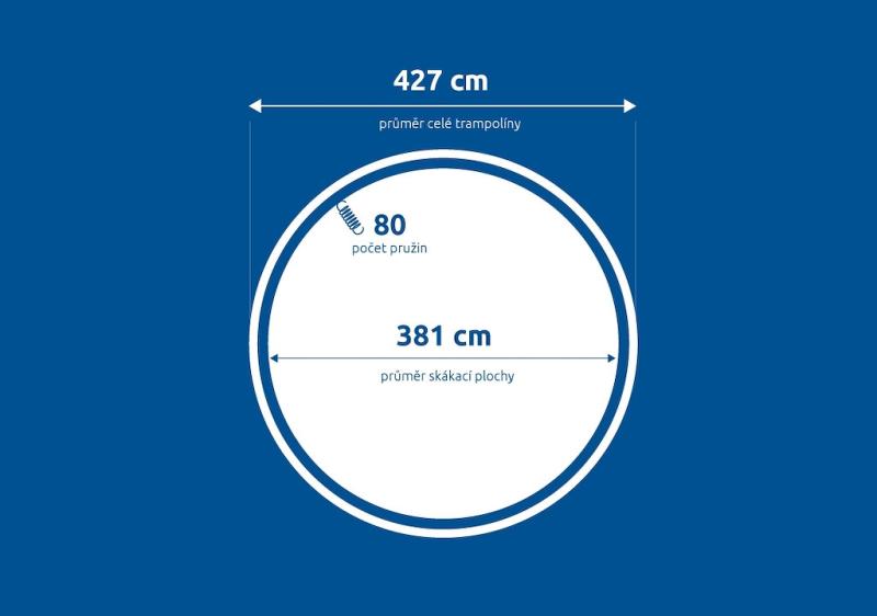 Průměr skákací plochy: 381 cm (měří se po vlákně tkaniny – od jednoho okraje k druhému přes střed).