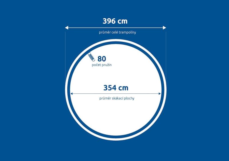 Průměr skákací plochy: 354 cm (měří se po vlákně tkaniny – od jednoho okraje k druhému přes střed, tolerance rozměru ± 2 cm).