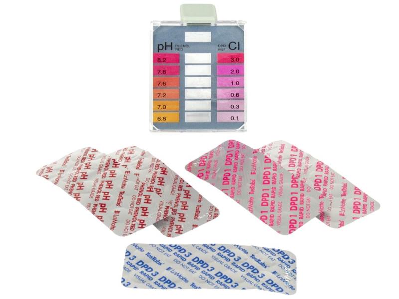 V sadě najdete samotný tester a tři druhy tablet pro měření pH a volného a vázaného chloru. Ideální hodnota pH je 6,8 až 7,2. Příliš zásadité pH od hodnoty 7,8 totiž vede k tvorbě různých minerálních zákalů, vodního kamene a jiných sraženin, stejně jako k vyšší dráždivosti vody a zvyšujícímu se obsahu škodlivého vázaného chloru. Ten vzniká při kontaktu volného chloru s potem a dalšími organickými látkami. Vázaného chloru se zbavíte použitím přípravku Chlor Shock.