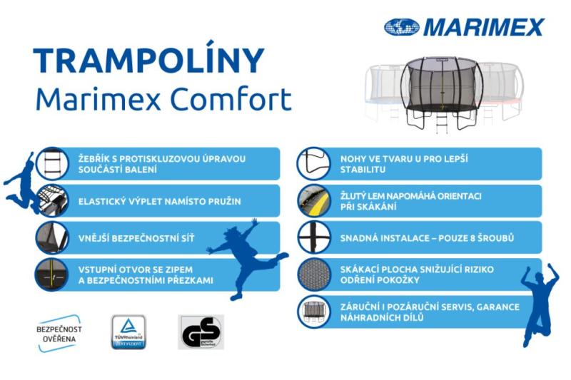 Bezpružinová trampolína Marimex Comfort je výnimočná vďaka novej technológii upevnenia skákacej plochy do rámu. Elastický výplet namiesto pružín je bezpečnejší, zvyšuje flexibilitu odrazovej plochy a spôsobuje mäkší dopad. Orientáciu pri skákaní napomáha žltý lem na odrazovej ploche. Bezpečnostná sieť na vonkajšej strane trampolíny je pružná a zároveň výborne drží tvar. Inštalácia kovovej konštrukcie i siete je veľmi jednoduchá.Dokonalú stabilitu zabezpečujú 4 nohy v tvare písmena U.