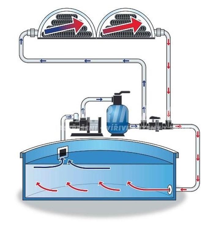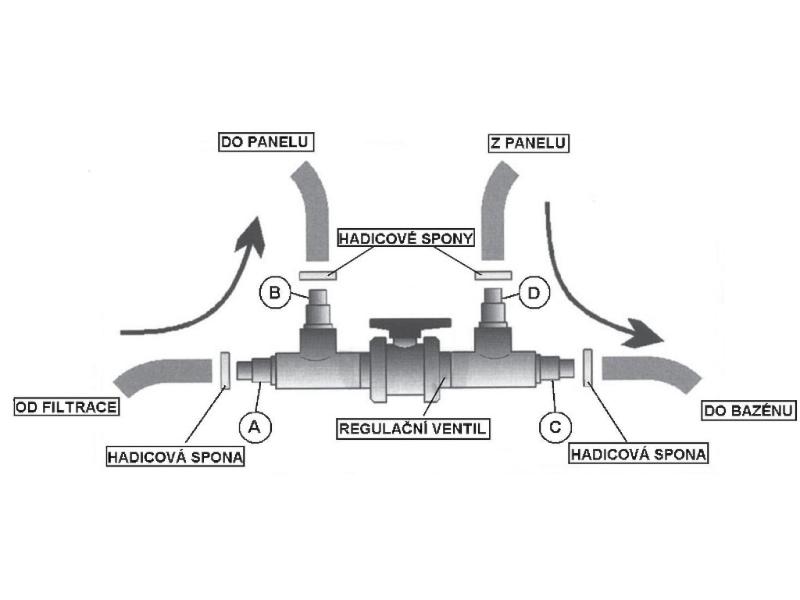 Toto rozdelenie v podstate funguje ako vypínač, či regulátor solárneho ohrievača, kedy sa cez ventil odkloní tok vody a prúdi tak priamo späť do bazéna. Ak teda na nočné filtrovanie bazéna chcete solárny ohrievač "vypnúť", pretože v nočných hodinách má solárny ohrievač opačný efekt a bazénovú vodu skôr ochladzuje, odporúčame použiť práve náš guľový ventil.