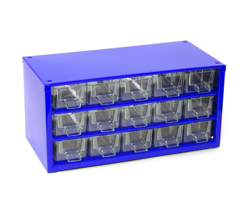 Kovová ukládací skříňka s plastovými zásuvkami 1 velikosti je vhodná pro přehledné skladování drobných předmětů a součástek.