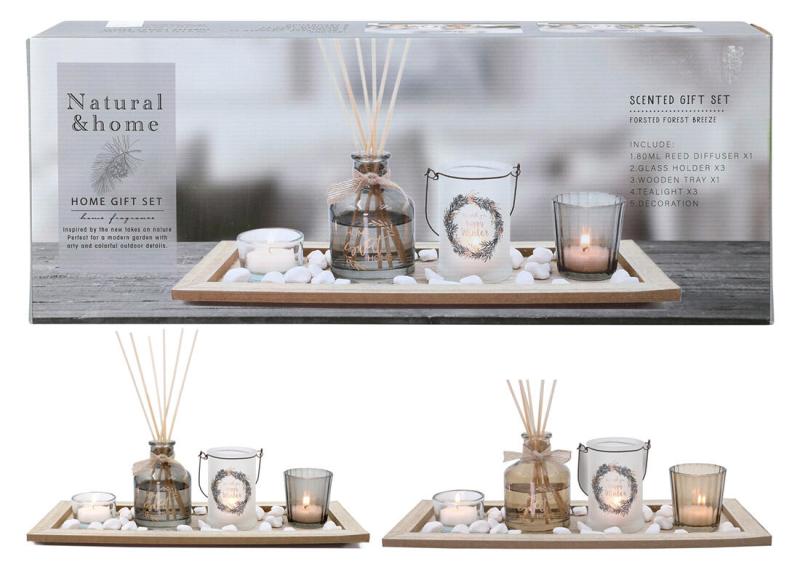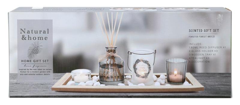 Obsahuje svíčku, kalíšky na čajovou svíčku a zmíněný difuzér s ratanovými tyčinkami.