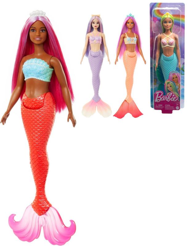 MATTEL Panenka Barbie jako pohádková mořská panna, 4 varianty provedení.Děti si zamilují snění o kouzelných podmořských příbězích s krásnými panenkami Barbie mořskými pannami! Každá mořská panna má trup inspirovaný mušlemi, vytvarovaný ocas a vlasy v pohádkových barvách zdobené doplňky. Děti od 3 let mohou sbírat různé mořské panny a vydávat se na různá vodní dobrodružství! Každá se prodává samostatně v závislosti na dostupnosti. Panenky Barbie nemohou plavat ani stát samostatně. Barvy a provedení dekorací se mohou lišit.